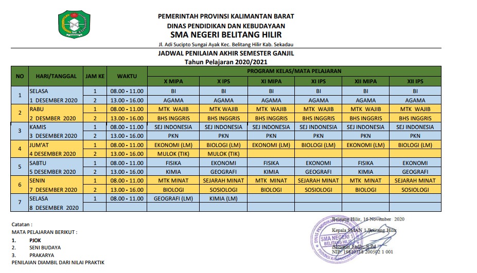 Jadwal Ulangan Daring Semster Ganjil Tahun Pelajaran 2020/2021