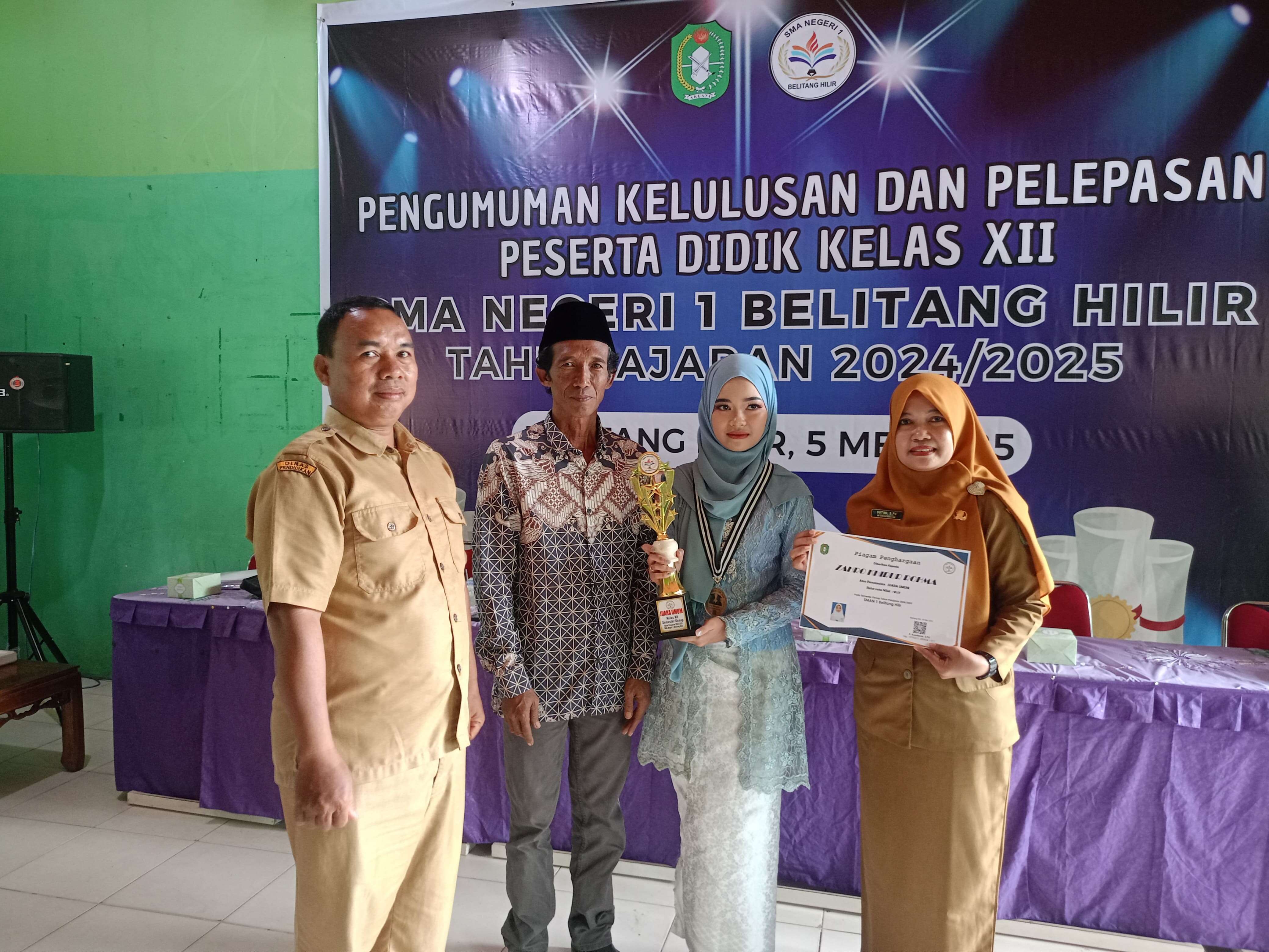 SMAN 1 Belitang Hilir Mengadakan Pengumuman Kelulusan serta Pelepasan Siswa/Siswi kelas XII SMAN 1 Belitang Hilir Tahun Pelajaran 2024/2025 pada tanggal 5 Mei 2025. Pada tahun pelajaran 2024/2025 SMAN 1 Belitang Hilir Meluluskan 150 Siswa dengan Kelulusan 100% yang mana siswa kelas XII yang terdiri dari jurusan MIPA berjumlah 66 Orang dan Jurusan IPS berjumlah 84 orang. Pada tahun ini Kelulusan ditentukan dari hasil Rapat dewan guru pada tanggal 30 mei 2025 dan juga memperhatikan Nilai Pengetahuan dan Keterampilan selama 6 Semester, pada tahun ini Sekolah mengadakan PSAJ (Penilaian Sumatif Akhir Jenjang sebagai pengganti Nilai UAS di semester 6). Nilai Siswa yang di tulis pada Ijazah di hitung berdasarkan hasil pengetahuan dan keterampilan dari kelas X sampai Kelas XII selama 6 semester. Berdasarkan Nilai Tertinggi/Terbaik pada kelulusan tahun ini pada jurusan MIPA yang terdiri dari MIPA 1 dan MIPA 2 maka di dapat siswa dengan nilai tertinggi dengan rata-rata 91,17 yaitu jatuh pada siswi atas nama ZAHRO KHIRUR ROHMA, Kemudian pada jurusan IPS yang terdiri dari IPS 1, IPS 2 dan IPS 3 maka di dapat siswa dengan nilai tertinggi dengan rata-rata 89,89 yaitu jatuh pada siswi atas nama APRIANI. Pada kegiatan ini juga Kepala Sekolah Bapak Kusnianar, S.Pd Mengundang Ketua Komite beserta Orang tua atau Wali dari Siswa/siswi kelas XII SMAN 1 Belitang Hilir. Pada kegiatan ini juga kepala sekolah dalam sambutannya secara resmi mengembalikan lagi siswa-siswi kelas XII tahun pelajaran 2024-2025 kepada orang tua Siswa/siswi kelas XII yang sudah di nyatakan lulus yang di titipkan oleh orang tua kepada sekolah selama 3 tahun dan di kembalikan lagi kepada orang tua siswa, dengan harapan seluruh siswa yang sudah lulus sukses kedepannya dalam menggapai cita-cita yang di inginkan.